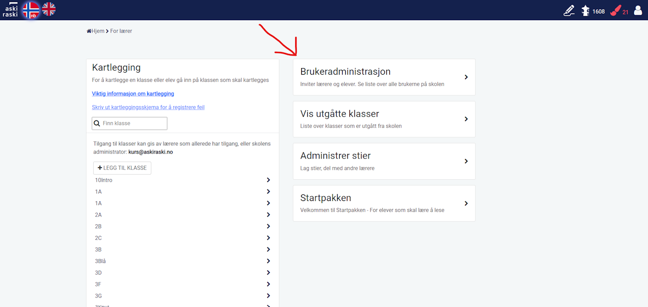 Brukeradministrasjon gir et oversiktsbilde over organisasjonen/skolen. Her kan man se hvilke lærere og elever som tilhører skolen, samt se hvilke klasser elevene er koblet til.