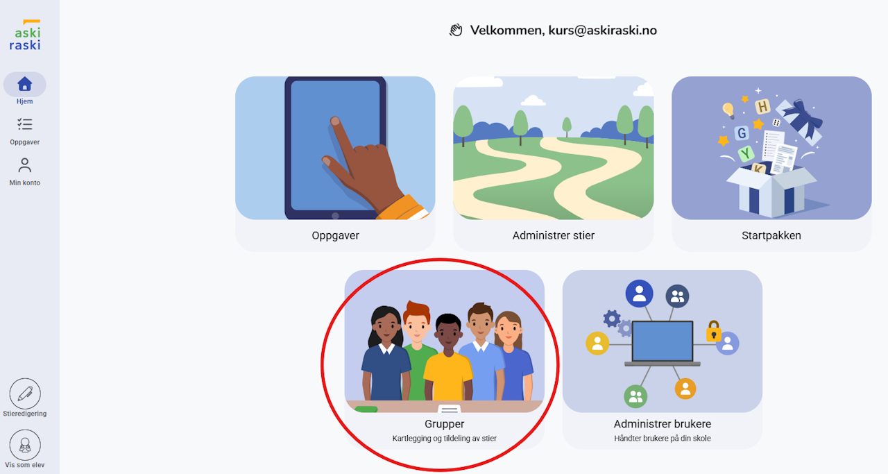 Logg inn i Aski Raski, trykk deretter på Grupper (bilde 1).