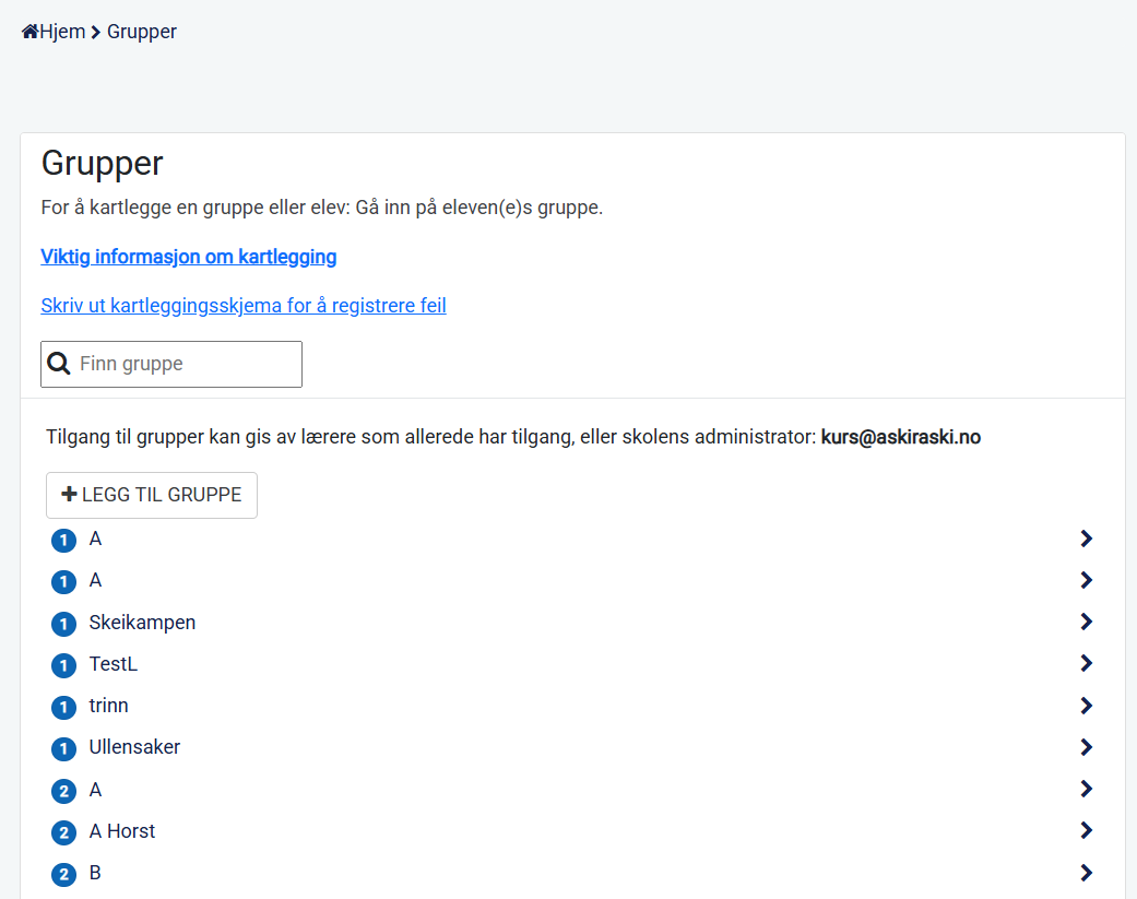 Når du klikker deg inn i oversikten, finner du gruppene og klassene som tilhører din skole. Grupper med hengelås er stengt for deg, men de med pil er tilgjengelige for deg (bilde 2). Trykk på den klassen du ønsker å kartlegge en eller flere elever i.