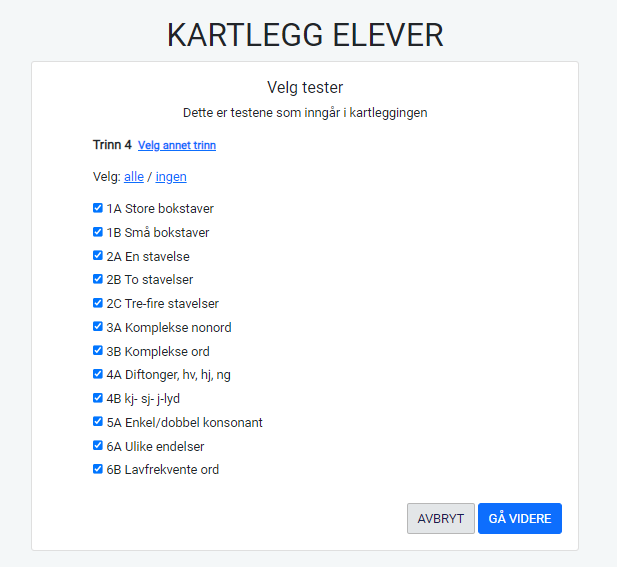Programmet anbefaler hvilke delprøver du bør ta på det gitte klassetrinnet. Hvis det er noen av delprøvene du ikke ønsker å ta, kan du ta bort avhukingen for den eller dem her.