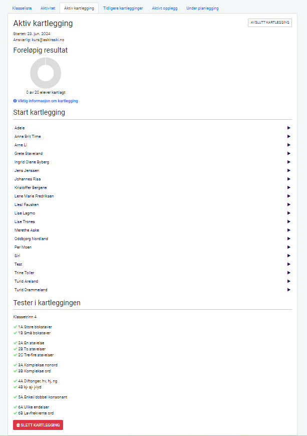 Etter godkjent valg av delprøver aktiveres kartleggingen og legges som en fane øverst i klassen med tittelen "Aktiv kartlegging".
