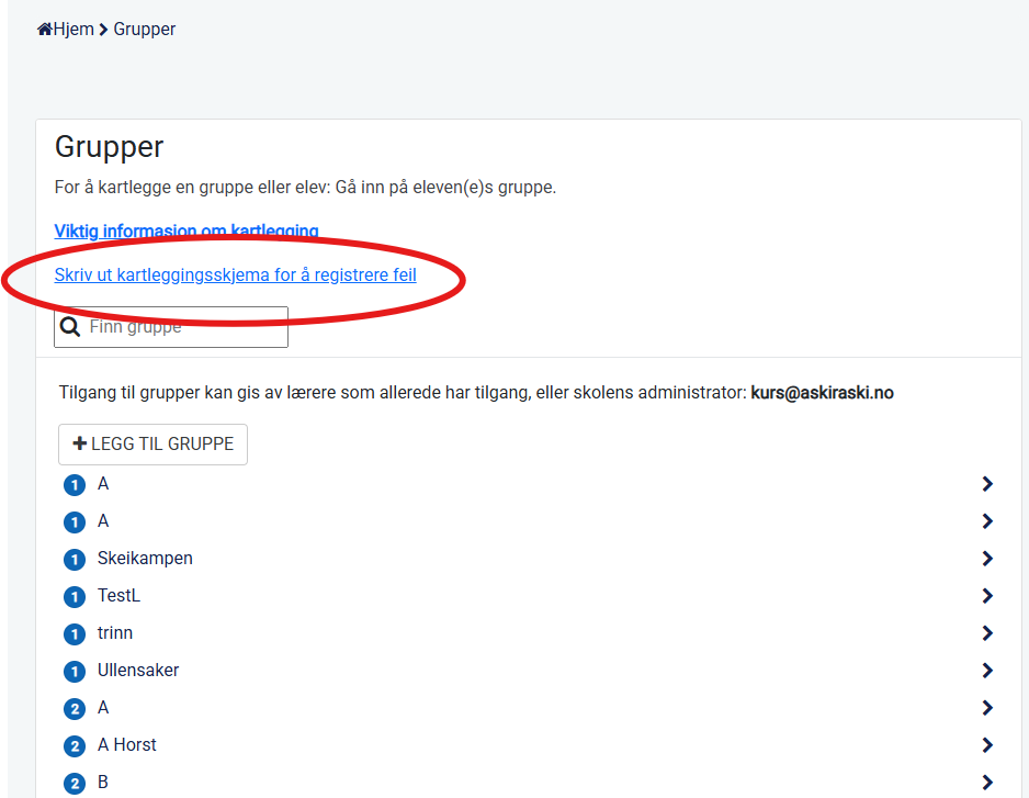 Kartleggingsskjemaet finner du inne på For lærer. Øverst til venstre, under overskriften "Kartlegging", er det en blå lenke: "Skriv ut kartleggingsskjema for å registrere feil". Velg bokmål eller nynorsk og skriv ut det ønskede antallet.