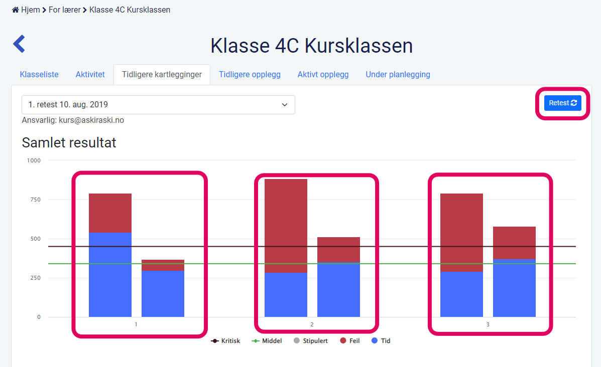 "Retest" er knappen øverst til høyre på fanen "Tidligere kartlegginger". Den brukes når/hvis du ønsker å teste klassen på nytt på samme klassetrinn og i samme deltester. En retest brukes typisk etter en innsatsperiode har blitt gjennomført.