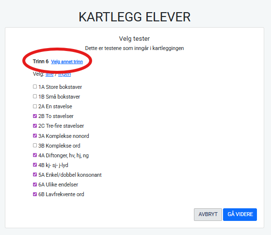 Det trinnet du har registrert klassen din som vil automatisk være valget som kommer opp når du skal starte en kartlegging. Basert på årstrinn du har registrert klassen din som foreslår programmet anbefalte deltester, og grenseverdiene for det årstrinnet vil bli benyttet.